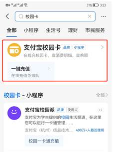 (1)支付宝充值:打开支付宝搜索“校园卡”或“校园派”,选择“支付宝校园卡”,如图所示,选择十大正规买足球网站,输入姓名、学号进行支付,支付成功后等2分钟自动到账,可在支付宝校园卡查询余额。